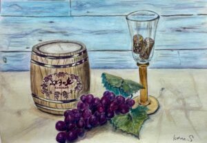 この絵は、単なる静物ではなく「時間」「記憶」「土地」といった抽象的なテーマを静かに語りかけてきます。ワイン樽は過去の記憶を、葡萄は現在の生命力を、コルクは未来への封印を象徴しているようにも読めます。
