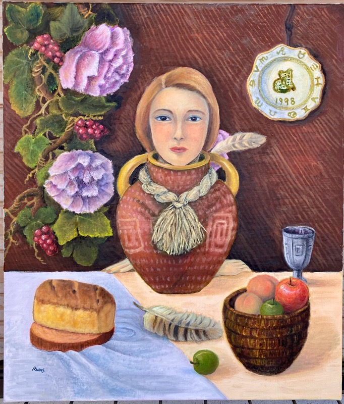 壺は単なる器ではなく、“記憶を蓄える存在”や“家族の象徴”のようにも見え、周囲の果物・パン・器物がその人格を取り巻く人生の断片のように機能しています。