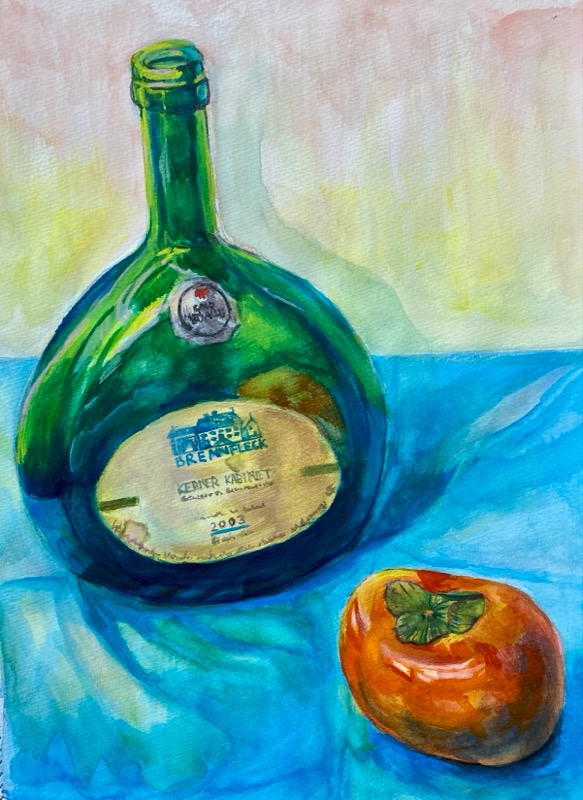 • ボトルと柿の配置は、静物画として非常に安定感があります。横たわるボトルと立体的な柿が、視線を自然に誘導し、画面に動きとバランスを与えています。