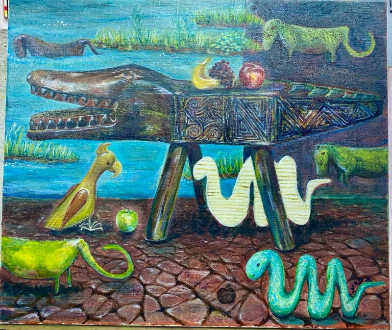 • 果物を背負うワニは、「運ぶ者」「媒介者」としての役割を持ち、創作者自身の姿とも重なります。