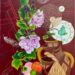 掛軸もアクリル絵具の下地の上に書や山水画を描いたので自然に画面空間に納まりました。タカキョンのアクリル画テクニック、磨きがかかってきましたね!