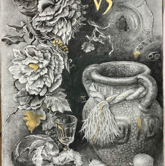 智美さんの今期大モチーフ木炭デッサンのご紹介です。 今回の智美さんの作品は「木炭デッサン」という枠を超えて、象徴性・装飾性・質感描写が高度に融合した、とても完成度の高い静物画になっています。 【総評:木炭の“重さ”と金の […]